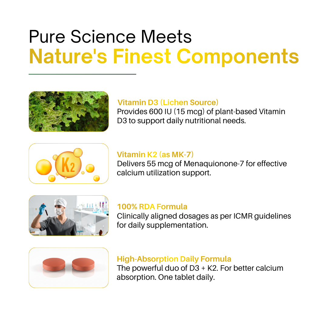 Elevate your health with our Vitamin D3 + K2 supplement and embrace the vitality that comes from strong bones, a robust immune system, and optimal calcium absorption. Order now to begin your journey to improved well-being!